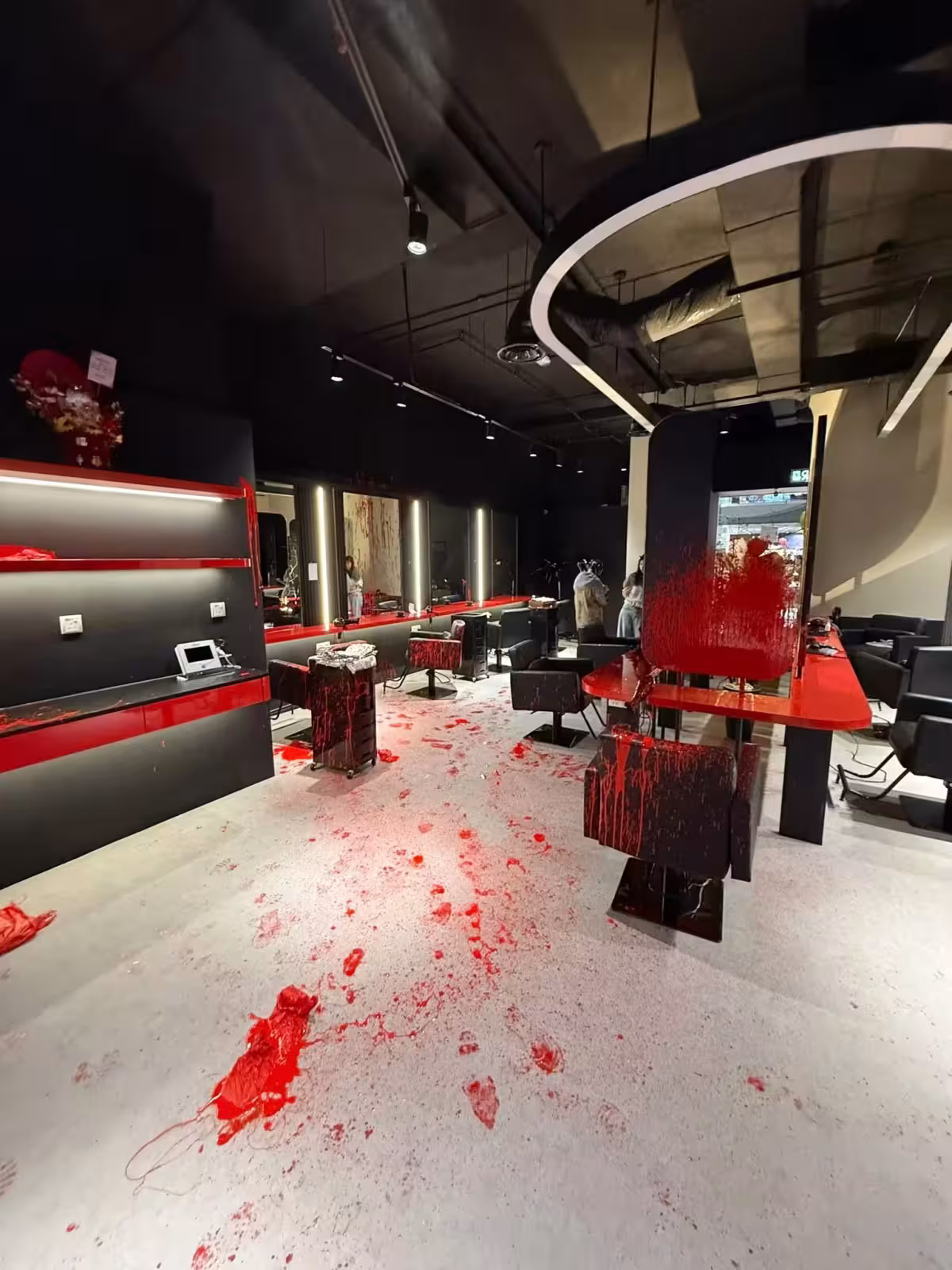 理髮院內到處都是紅漆。