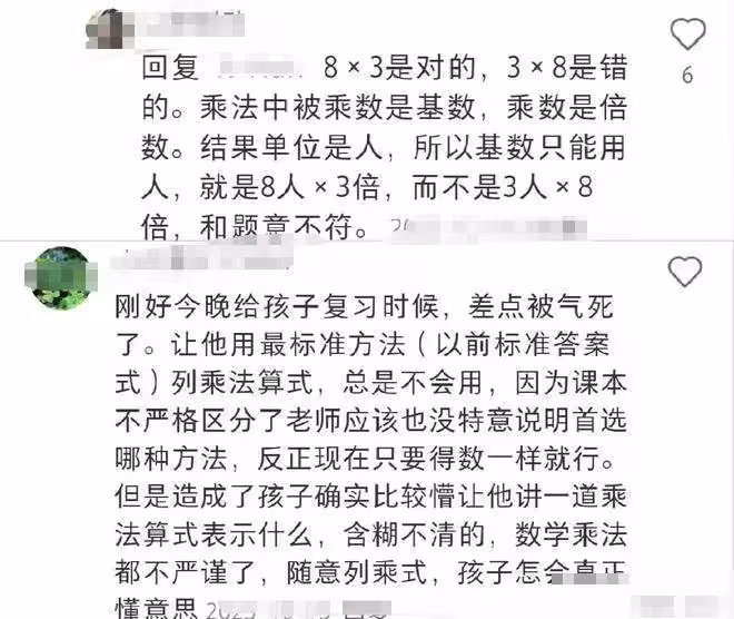 不少家長遇到了同樣的問題,覺得現在的教材不夠嚴謹。一位媽媽說,她讓孩子講一道乘法算式表示什麼意思,孩子總是含糊不清的;她讓孩子用以前最標準的方法列乘法算式,孩子總是不會用,反正現在只要得數一樣就行。家長覺得還是以前的教材更嚴謹科學,更容易理解。