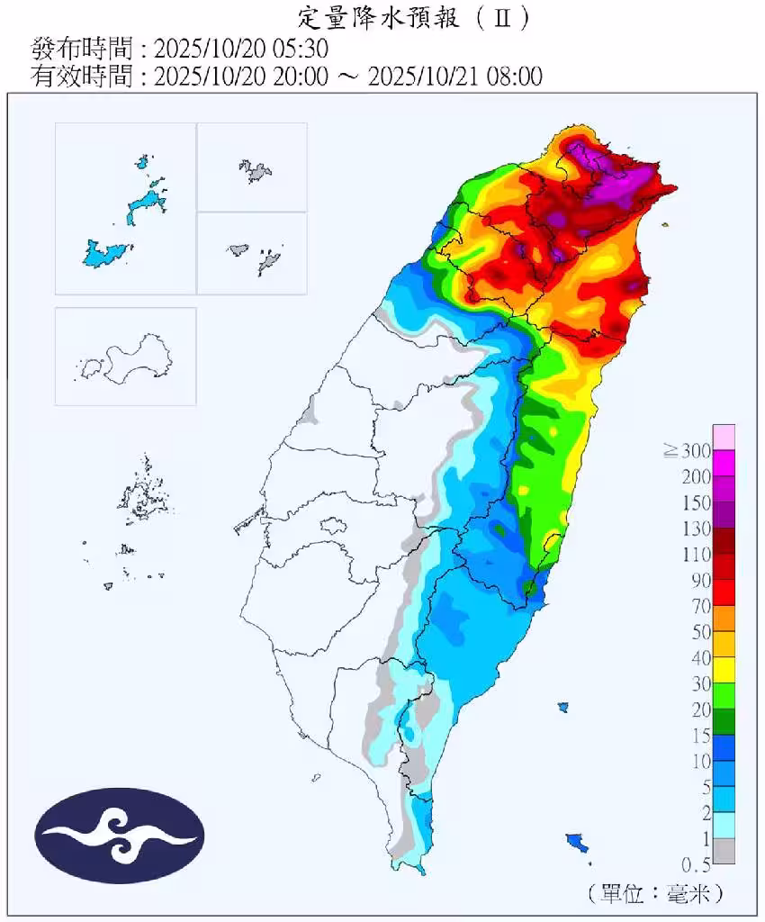 氣象署預報,周二東北季風及颱風外圍環流影響,有機會出現共伴效應,桃園以北、東北部、東部地區及北部山區有陣雨或雷雨,並有局部大雨或豪雨機率,其中東北部、基隆北海岸、大台北山區易有局部豪雨等級以上降雨;新竹、苗栗、東南部及中南部山區有短暫陣雨,並有局部大雨機率,其他地區亦有局部短暫陣雨。