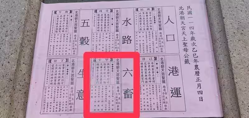 今年2月1日北港朝天宮舉辦接神儀式並抽公籤,由北港朝天宮董事長蔡詠鎝抽出人口、水路、五穀、港運、六畜及生意簽等6支簽。其中六畜簽抽到「甲午」簽,簽文寫道:「風恬浪靜可行舟,恰是中秋月一輪。凡事不須多憂慮,福祿自有慶家門。」廟方對於公簽解說為:「上半年應該頗順遂,但下半年恐有變。尤其農曆九月初會有變化,應稍加留意。」