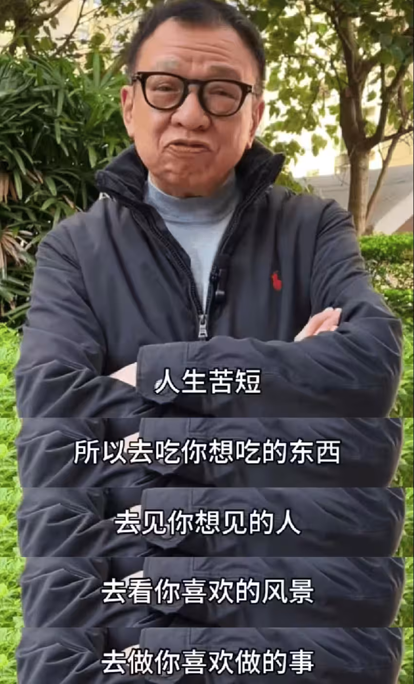 這份豁達也體現在他的人生態度上,主張「人生苦短,過好當下,想吃就吃,想見誰就見,不留遺憾」,對生死和人際關係看得很淡。