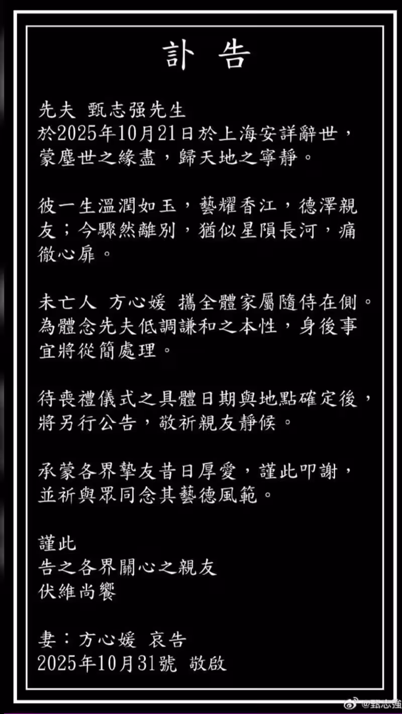 聲明全文先夫 甄志強先生於2025年10月21日於上海安詳辭世,蒙塵世之緣盡,歸天地之寧靜。