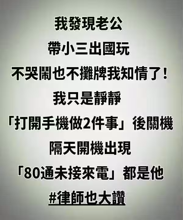 前陣子聽做律師的朋友陳姐說起一個案例,35歲的林小姐發現老公帶小三出國旅遊後,沒有哭鬧也沒有質問,而是冷靜地提前「處理信用卡和帳戶」,第二天早上,林小姐開機後,看到老公一夜之間打了80通未接來電,還有幾十條催她解鎖支付的訊息,她只淡淡回復了一句「我們談談離婚吧」