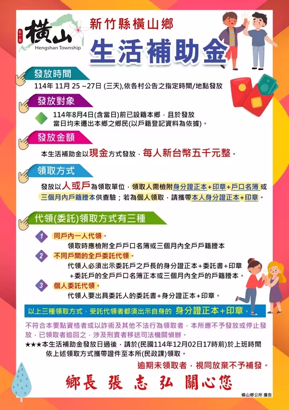 新竹縣橫山鄉今(25日)一連三天加碼普發5000元。