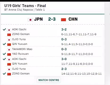 來到女團冠軍戰,中國U19隊與日本隊的比賽打得非常膠著和激烈。縱歌曼先是以2-3輸掉第一盤,覃予萱在第二盤以3-0扳平比分。此後,雙方各勝一盤,比分戰成2-2平局。決勝盤,縱歌曼頂住壓力,以3-2逆轉小鹽悠菜,幫助球隊以3-2奪得冠軍,祝賀中國U18女隊!