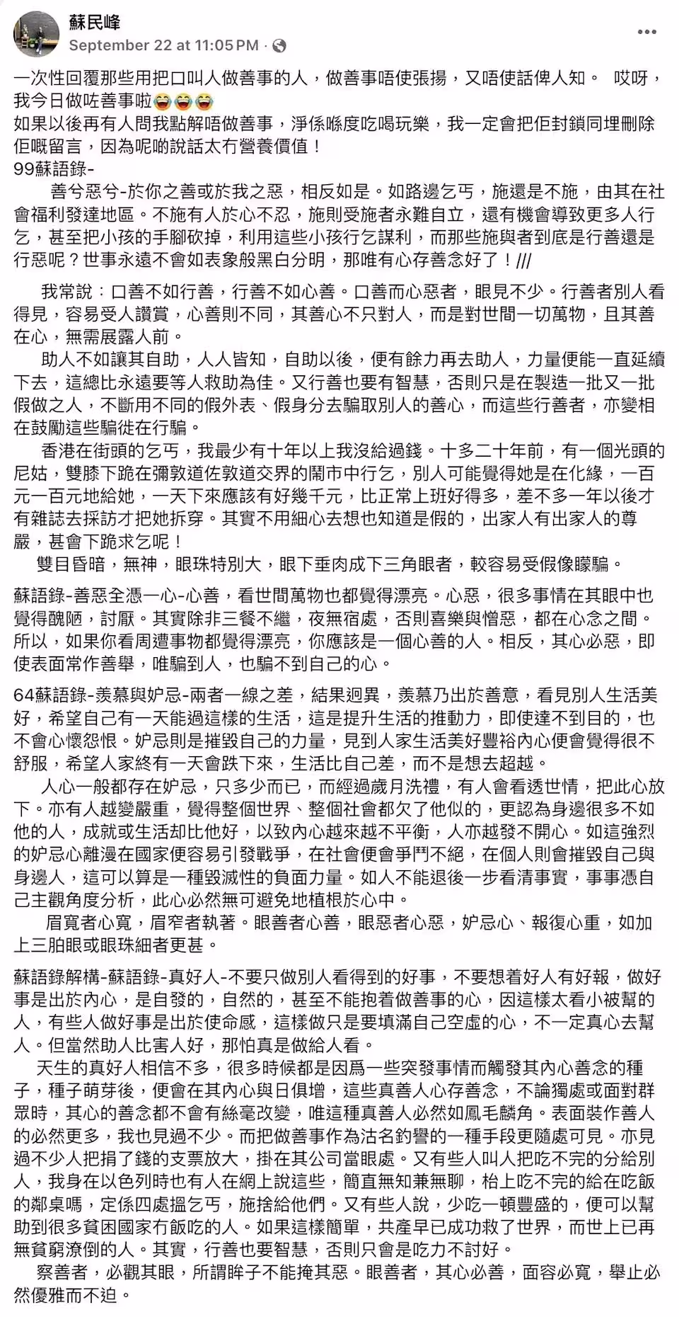 此前有網民誤以為現時蘇民峰只顧吃喝玩樂不做善事,蘇民峰髮長文反擊,分享99條蘇氏語錄,並強調做善事不需要張揚,表示:「一次性回復那些用嘴叫人做善事的人,做善事不用張揚,又不用告訴別人。哎呀,我今天做了善事啦。如果以後再有人問我為什麼不做善事,只顧在這裡吃喝玩樂,我一定會把他封鎖並且刪除他的留言,因為這些話太沒有營養價值!」