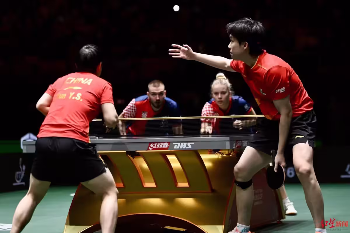 昨晚對陣「混團新軍」智利隊,孫穎莎和王楚欽均未出戰。今天下午與克羅埃西亞的第一場混雙比賽,「莎頭」組合就登場亮相,這也是繼揭幕戰之後,孫穎莎和王楚欽再次出戰混雙比賽,這也徹底點燃四川省體育館的現場氛圍。克羅埃西亞隊派出的則是伊沃·本/哈娜·阿拉波維奇的組合,雖然身材高大的伊沃·本打法比較兇猛,但女選手哈娜·阿拉波維奇是兩人中的短板,這也讓「莎頭」沒有費太大的氣力,就以11比6先下一城。之後,在「莎頭」組合自信果斷地進攻下,克羅埃西亞組合失誤不斷,「莎頭」以兩個11比5取勝,中國隊以3比0領先。