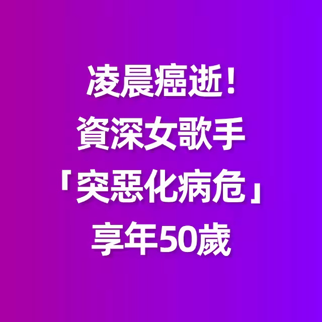 凌晨癌逝!!! 資深女歌手「突惡化病危」享年50歲 昔勇敢「公開坎坷經歷」丈夫悲慟:趕去還是來不及