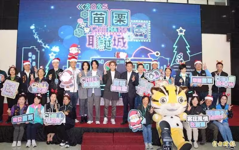 苗栗耶誕城活動19日至24日在竹南運動公園登場,由縣長鍾東錦(後排左7)等人共同主持啟動儀式。