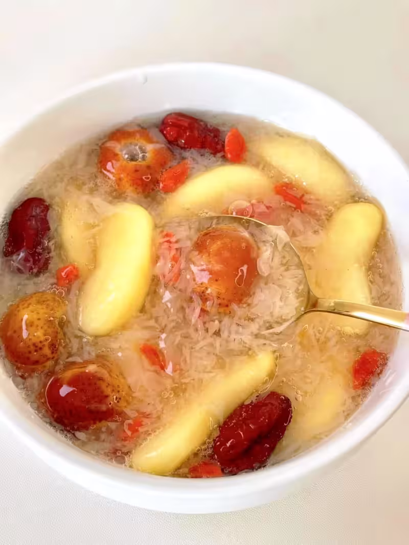 蘋果潤肺生津,山楂助消化,銀耳富含膠質,搭配紅棗和枸杞,暖暖甜甜的,孩子愛喝,還能清清內熱,幫助消化,冬天經常喝身體好!