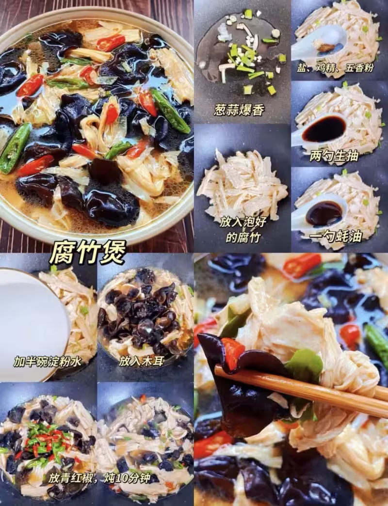 先把蔥蒜爆香,放進泡好的腐竹,淋上生抽和蚝油,加一碗澱粉水,再放進木耳和青紅椒慢慢燉,讓腐竹吸滿木耳的脆爽和青紅椒的鮮辣。腐竹軟嫩入味,木耳脆生生的,每一口都是鮮香中帶著微微的辣,像把山野的清新都燉進了碗里,簡單卻滿是讓人驚喜的味道~