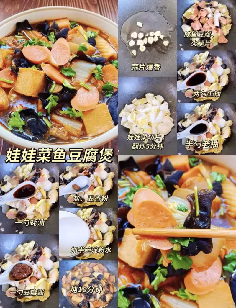 先把蒜片爆香,放進魚豆腐和火腿片,再加入娃娃菜翻炒,淋上生抽、老抽和蚝油,加一碗澱粉水慢慢燉,讓娃娃菜吸滿魚豆腐的鮮和火腿的香。娃娃菜軟嫩多汁,魚豆腐彈牙入味,每一口都是咸香中帶著微微的甜,像把小日子的溫柔都燉進了鍋里,暖得人心裡滿是歡喜~