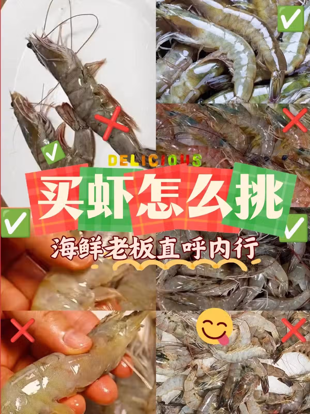 ❌蝦頭髮紅的、白色斑點不買(新鮮度不夠,有的可能被病菌感染)