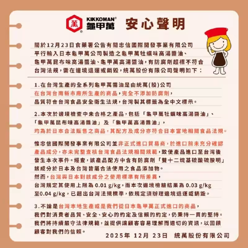 至於此次遭檢驗不合格的商品,其實是由非正式授權的貿易商忠信公司所進口,該業者在引進前並未詳細確認產品成分,也沒有完整比對台灣食品法規的相關規定,才會導致這起事件發生。
