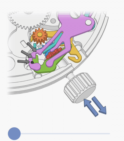 當我們推入和拉出錶冠時,拉檔上的小柱最終會卡入這三個位置之一。為了在凹槽之間跳躍,那個小柱子會彎曲拉檔夾板的長臂,這會產生將那個小柱子推入最近的凹槽的張力。我們最終得到了三個不同的檔位,所有部件都會參與其中——一旦鎖定,我們就可以可靠地轉動錶冠,而不會有意外改變當前模式的風險。
