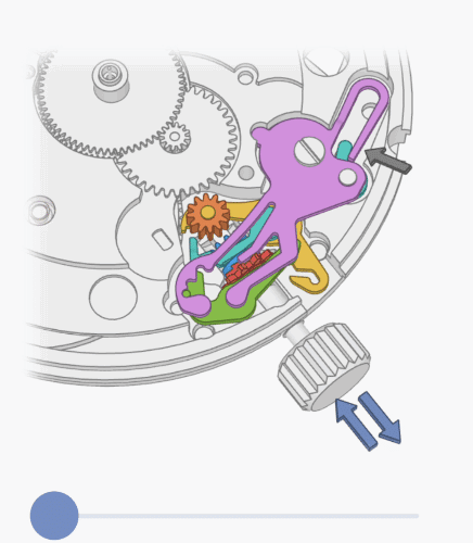 此外,如果您還記得,我們在開始研究上鏈機構之前,在主板上放置了一個小槓桿,這個小槓桿叫止秒簧。止秒簧的短端安裝在離合輪的凹槽中。當我們拉動錶冠並移動離合輪時,該槓桿就會旋轉: