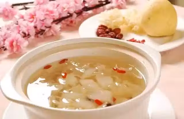 4.銀耳煮好後,加入梨和枸杞,冰糖大火煮開後,再轉小火煮十分鐘即可