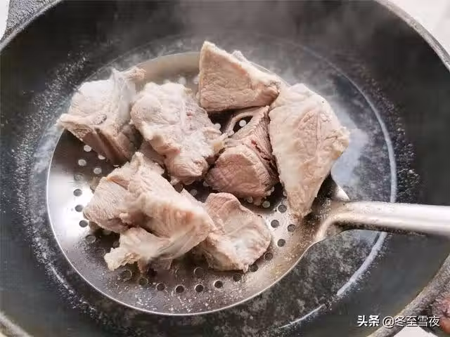 鍋內加入水,冷水下入豬骨頭,加入料酒,燒開,煮4-5分鐘,將骨頭的血沫煮出來,做出的湯不腥,撇去浮沫,將骨頭撈出,放入溫水中洗凈。