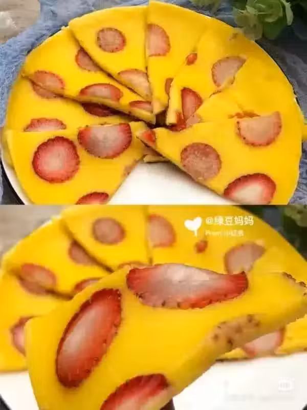 3. 平底不粘鍋中倒入麵糊,再擺上草莓片,加蓋最小火煎8-10分鐘左右即可。