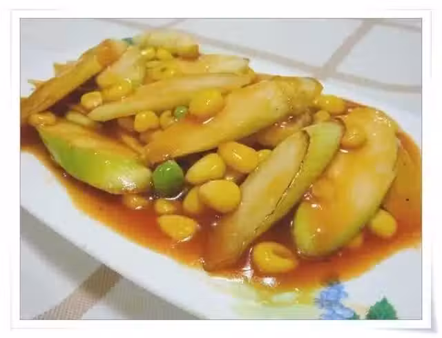 原料:新鮮茭白(如圖)、玉米、碗豆、番茄醬
