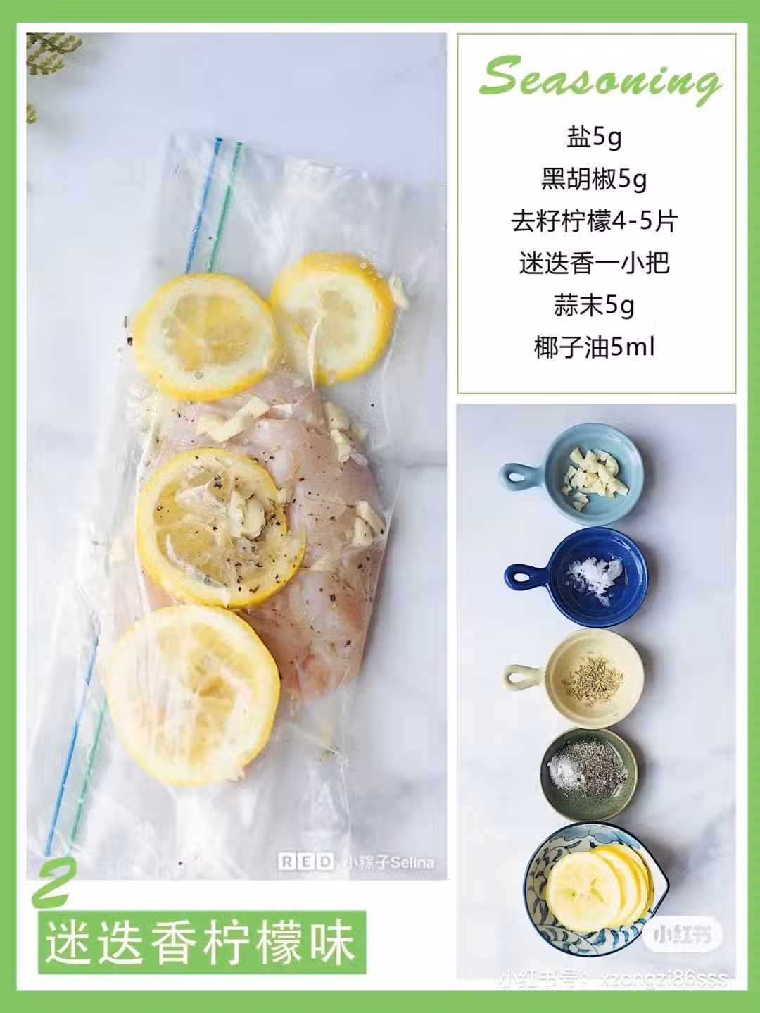 鹽5g 黑胡椒5g 去籽檸檬4-5小片 迷迭香一小把 蒜末5g 椰子油5ml