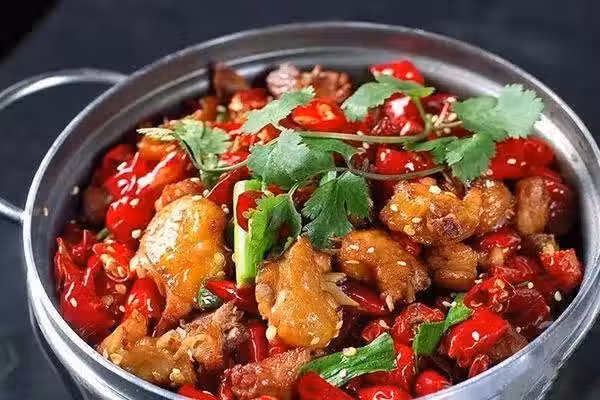 10、最後把炒好的雞塊倒在干鍋上,灑上白芝麻,上干鍋火上一邊加熱一邊吃即可。如果沒有用干鍋的話,直接把兩種食材混在一起炒上2分鐘也很好吃