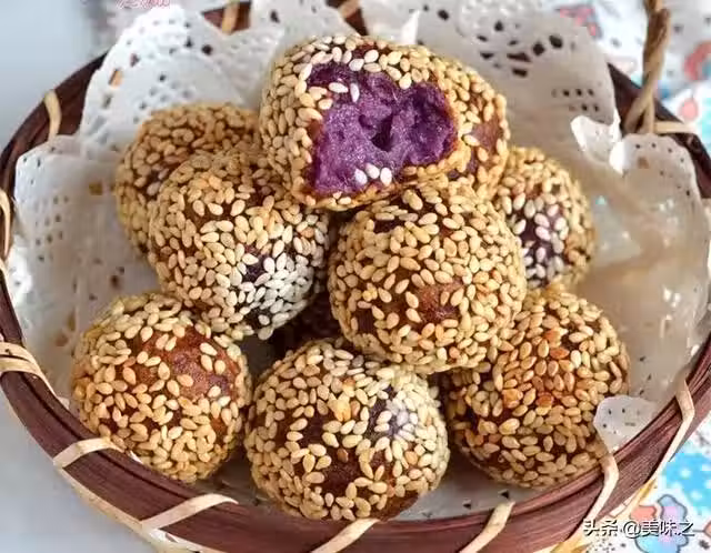 7、待芝麻變成淡黃色就可以撈出來了,趁熱吃,外焦里嫩,芝麻香、紫薯香,還有少許的糯米軟糯的口感,香極了。