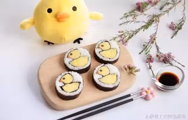 15 切好後用海苔剪成鴨子眼睛黏上即可。