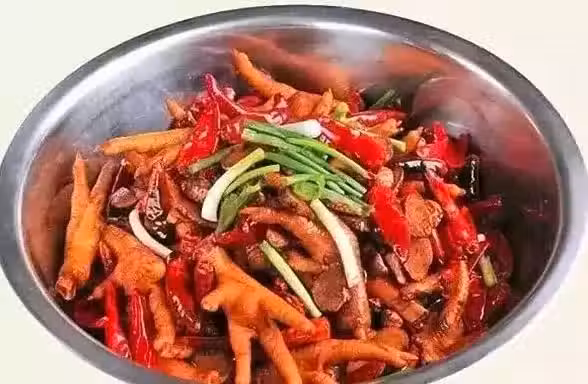 2、凈鍋里放油燒熱,先下薑片、大蒜、干辣椒節、八角和桂皮爆香,在倒入雞爪並烹入料酒翻炒片刻後,加入醬油、生抽、鹽、糖和五香滷水汁,炒至上色再摻入適量清水。大火燒開後轉小火,燒至汁干時才放入蚝油,快速翻炒至鍋里的汁變濃稠,撒入小蔥節便起鍋裝盆,開吃!