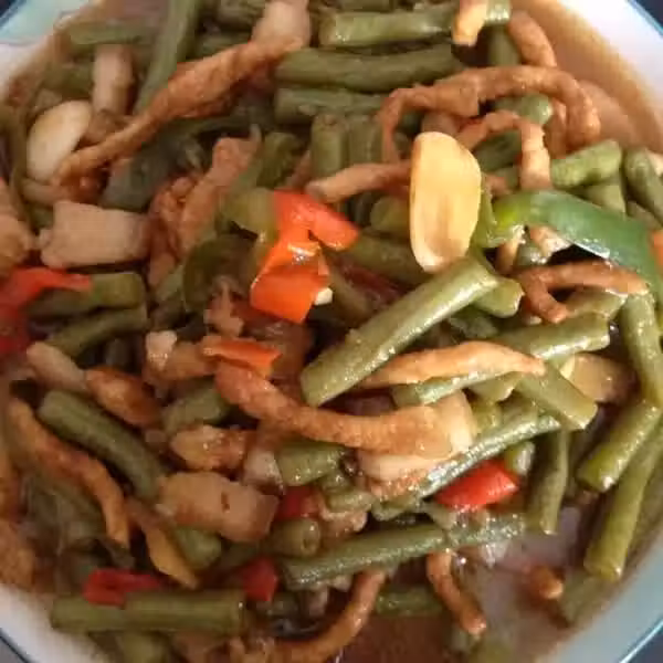 用料:里肌肉3OO克、四季豆半把、大蒜(切成蒜蓉)3,4瓣、食用油適量、醬油(生抽)2勺、澱粉2勺、鹽適量、老抽(增色用)1勺