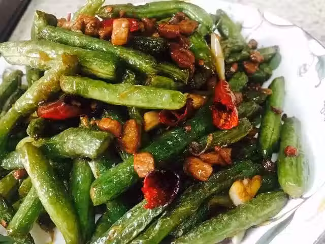 用料:長四季豆1斤 、花椒一勺、麻椒一勺、幹辣椒段一大勺、蒜碎、薑碎、蔥碎若干、肉餡2兩、澱粉一勺、料酒兩勺、生抽、老抽、糖、鹽。