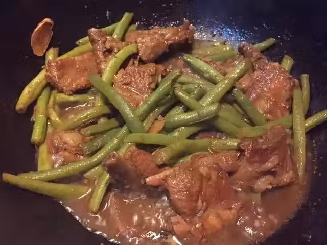 用料:排骨1斤、四季豆300克、鹽1/2茶匙、油45毫升、醬油20毫升、白糖10克、料酒15毫升、薑10克、澱粉5克、鹽5克、高湯、香蔥段少許