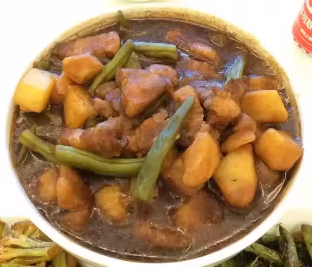 1.馬鈴薯去皮切塊,四季豆去頭尾、去老筋、用手掰成段,五花肉切大塊;