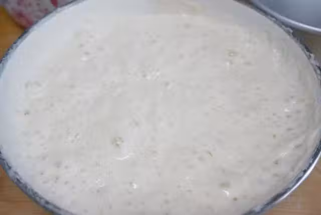 3.攪拌好的麵糊中加入白糖和酵母,攪勻。蓋上保鮮膜發酵1個小時左右。發酵至蜂窩狀就好了。