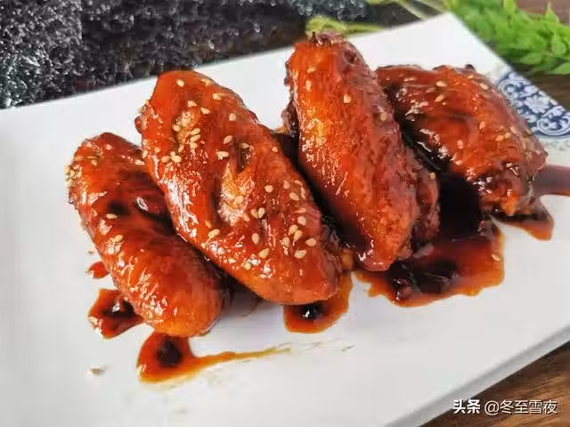7.燒制剩少許湯汁時,挑出蔥段、薑片、蒜粒和大料,改用大火收汁,最後剩少許汁包裹在雞翅上,淋入米醋翻炒均勻,盛出裝盤,撒上白芝麻即可,一盤酸酸甜甜的糖醋雞翅就做好了。