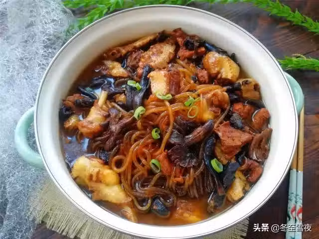 7.到時間後下入榛蘑,繼續燉20分鐘,到時間後,下入粉條,鹽,翻炒均勻,大火收汁即可。
