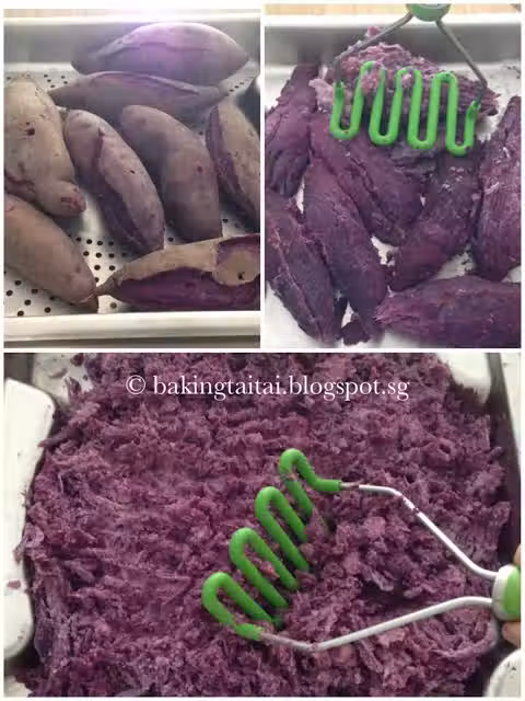 4. Use a spoon to spread the mashed purple sweet potato verythinlyonto a non-stick baking paper.