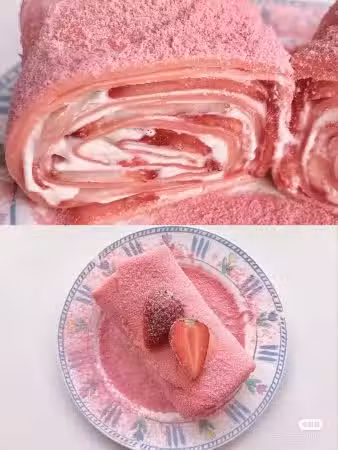 5 4張卷皮折疊放在一起,塗抹上奶油和草莓片,從右往左捲起來,捲成毛巾狀