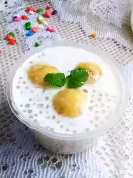 6 晾涼的西米和香蕉都放入碗裡,再加入牛奶下去。