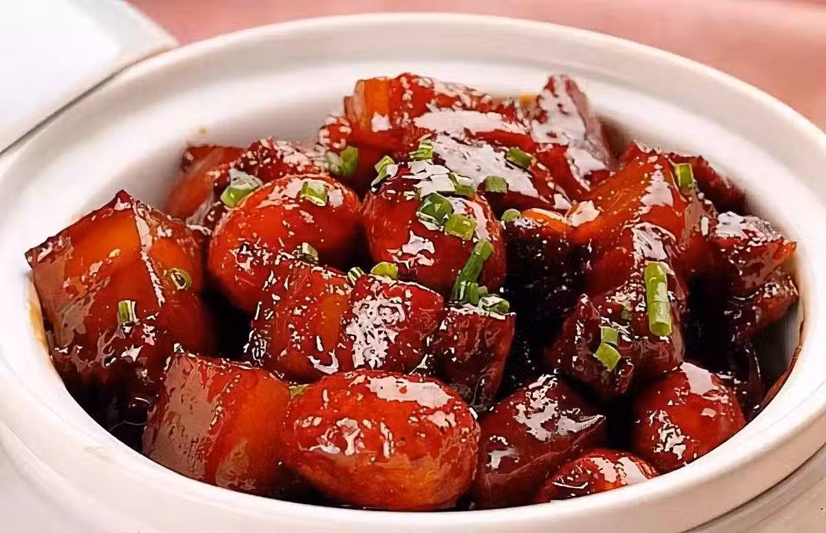 原料:五花肉、糖、生抽、鹽、蔥、姜、八角、花椒、桂皮、料酒
