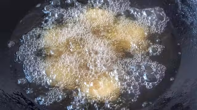 5、熱鍋倒油,油溫五成熱把糖糕放進去炸,火不要太大了,讓它慢慢的炸,注意翻面,慢慢地,你就看到糖糕變的鼓了起來。