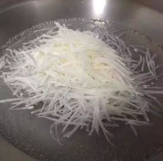 剁碎往白蘿蔔絲中加入少量蔥花、鹽、黑胡椒粉、香油,攪拌均勻。