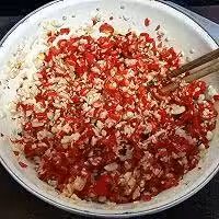 3. 將切碎的辣椒、大蒜裝入盆中,多加些食鹽,少許雞精,少許胡椒,拌勻。