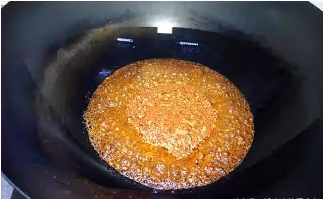 5、轉小火將鍋中的辣椒粉組合下鍋翻炒。