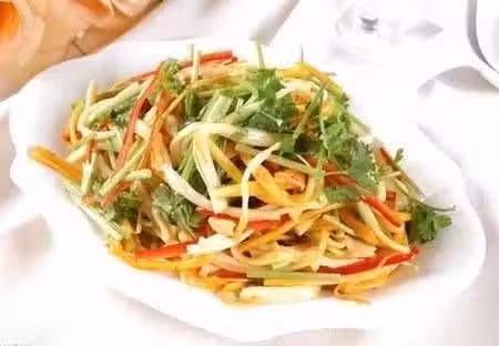 2、然後油鍋燒熱,先下辣椒絲爆炒,淋一點醋;