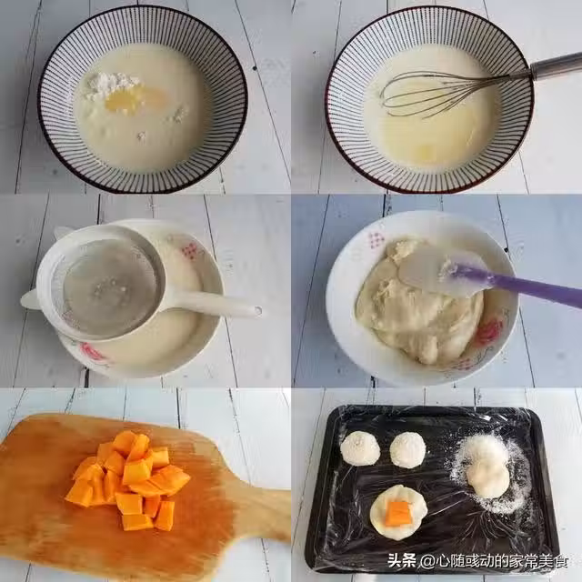 6.把冷藏好的糯米麵糰拿出來,手上弄一點清水,取一小塊糯米麵糰,揉圓,按扁,包入芒果粒,封口,再均勻的裹上一層椰蓉就可以了。