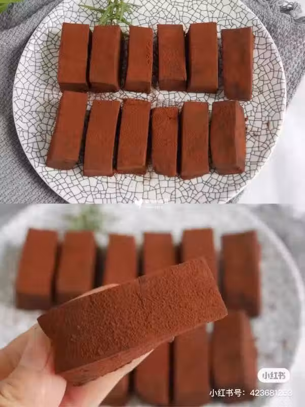 (三)大盤中鋪油紙,放入巧克力糯米糰整理平整,冷藏1小時,篩入
