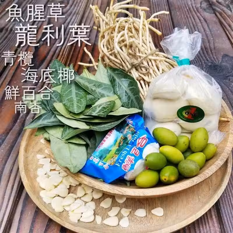 龍脷葉、魚腥草、泰國海底椰、鮮百合、青欖、南杏配蜜棗、果皮、冰糖