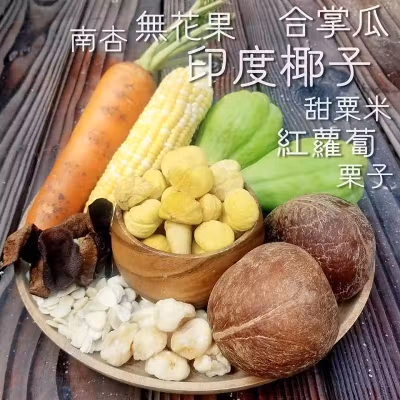 印度椰子、合掌瓜、紅蘿蔔、甜粟米、栗子、無花果、南杏配果皮