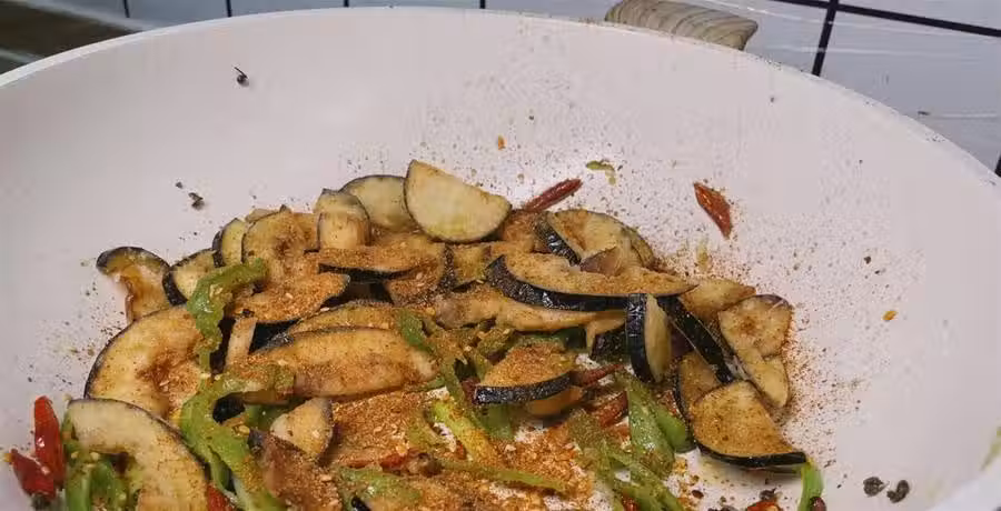 9、接著倒入炸好的茄子,用中小火翻炒,讓茄子均勻的裹上配料的香氣,這樣會增加口感,再撒上這道菜的靈魂調料,萬能的燒烤料,可以適當的多來一些,因為這道菜沒有加別的調料,快速的顛個勺,讓燒烤料均勻的裹到茄子上,這樣,才更加的好吃,然後,再隨意的翻炒,就可以出鍋了,裝入盤中。